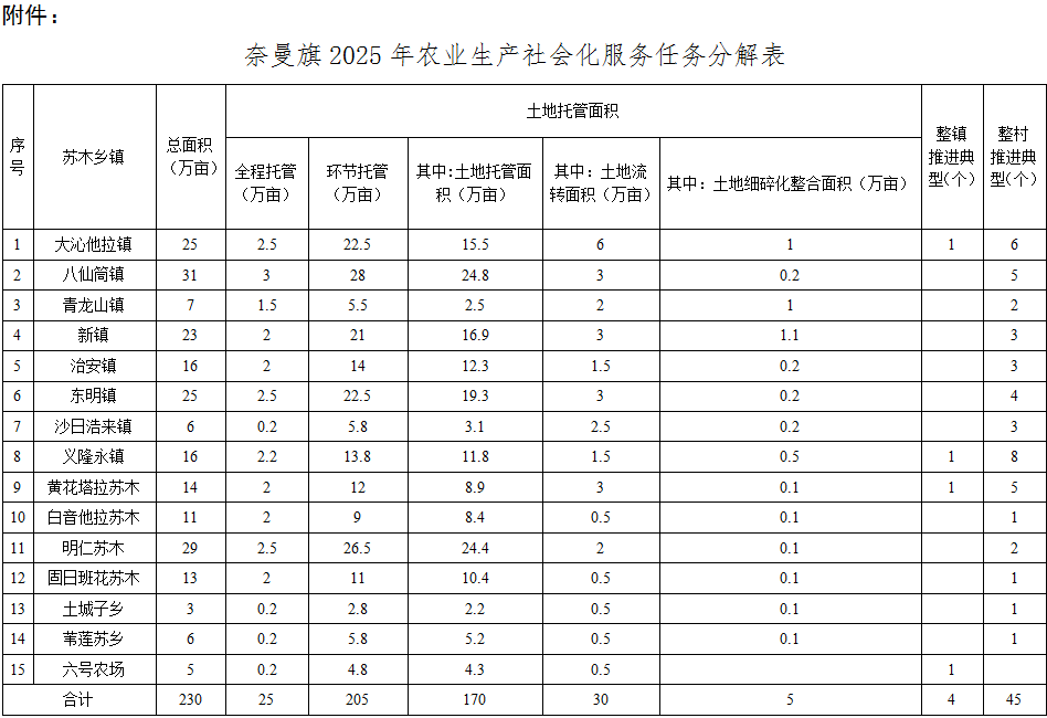 附件:奈曼旗 2025年农业生产社会化服务任务分解表