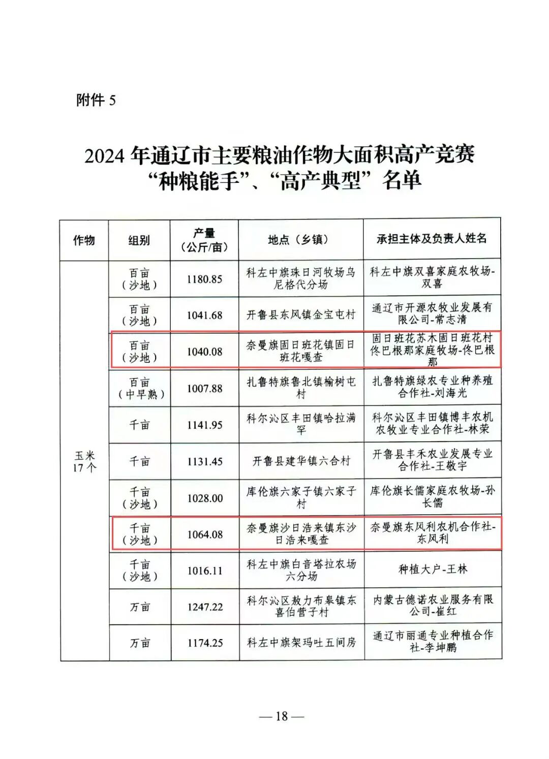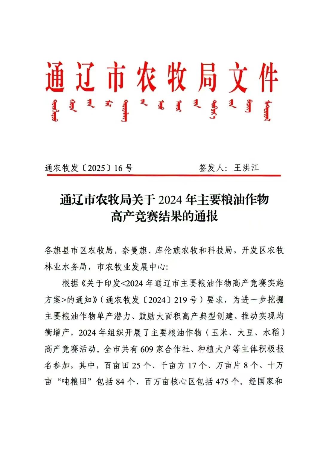 近日,通辽市农牧局举办 2024 年主要粮油作物高产竞赛,旨在深挖单产潜力,力促均衡增产。赛场上,各旗县农户高手过招、竞逐高产。经激烈比拼,我旗固日班花苏木固日班花村佟巴根那家庭农牧场的佟巴根那荣获 “种粮能手” 称号,奈曼旗东风利农机合作社的东风利获评 “高产典型”,二人凭精湛技艺与科学管理脱颖而出,成粮油增产 “排头兵”,为当地农户树立标杆。