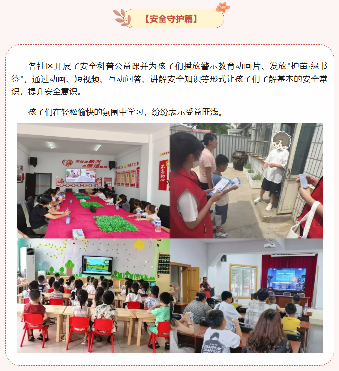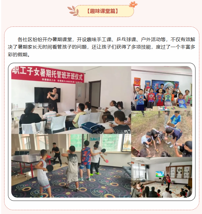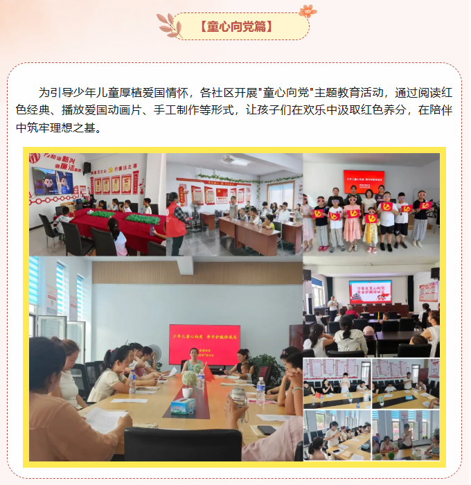 为丰富儿童暑期生活,促进健康成长,大沁他拉街道妇联联合15个社区开展"少年儿童心向党,牵手护航伴成长"系列关爱活动。各社区结合自身特色,推出安全教育、趣味课堂、亲子实践等多元化服务,累计惠及辖区儿童430人次。