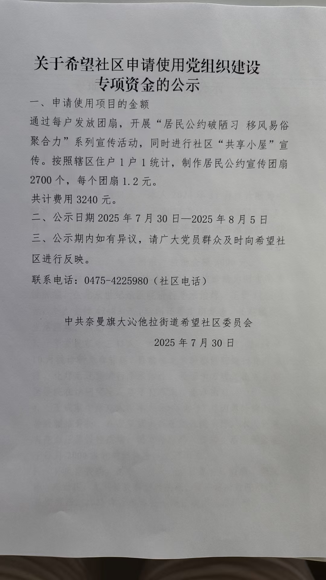 关于希望社区申请使用党组织建设资金的公示(团扇)