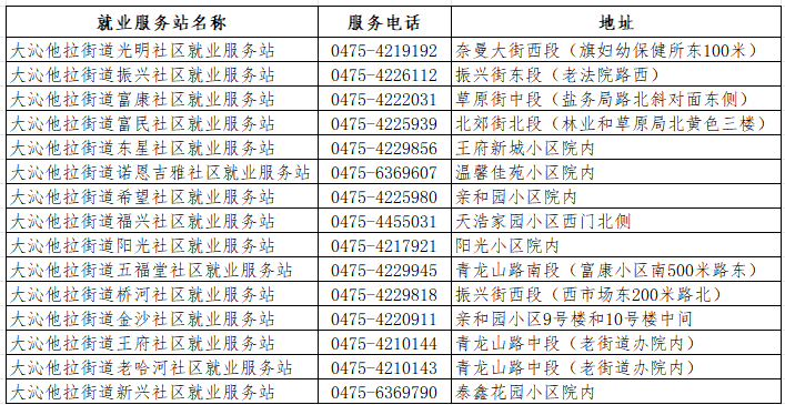 感谢大家对街道社区就业服务工作的支持与配合!如有疑问,可拨打咨询电话:0475-4211502(大沁他拉街道社保所)