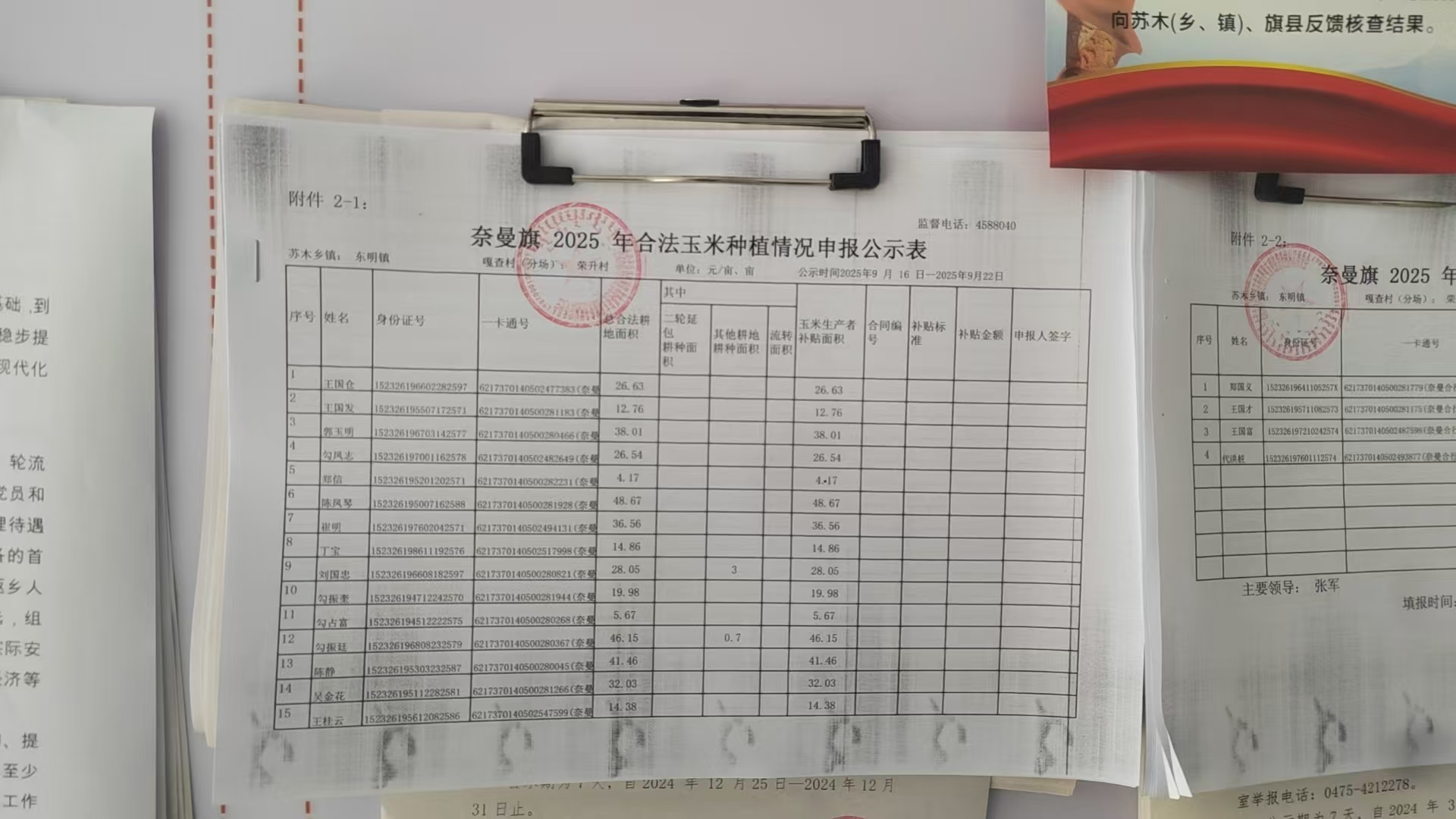 奈曼旗2025年合法玉米、大豆种植情况申报公示表