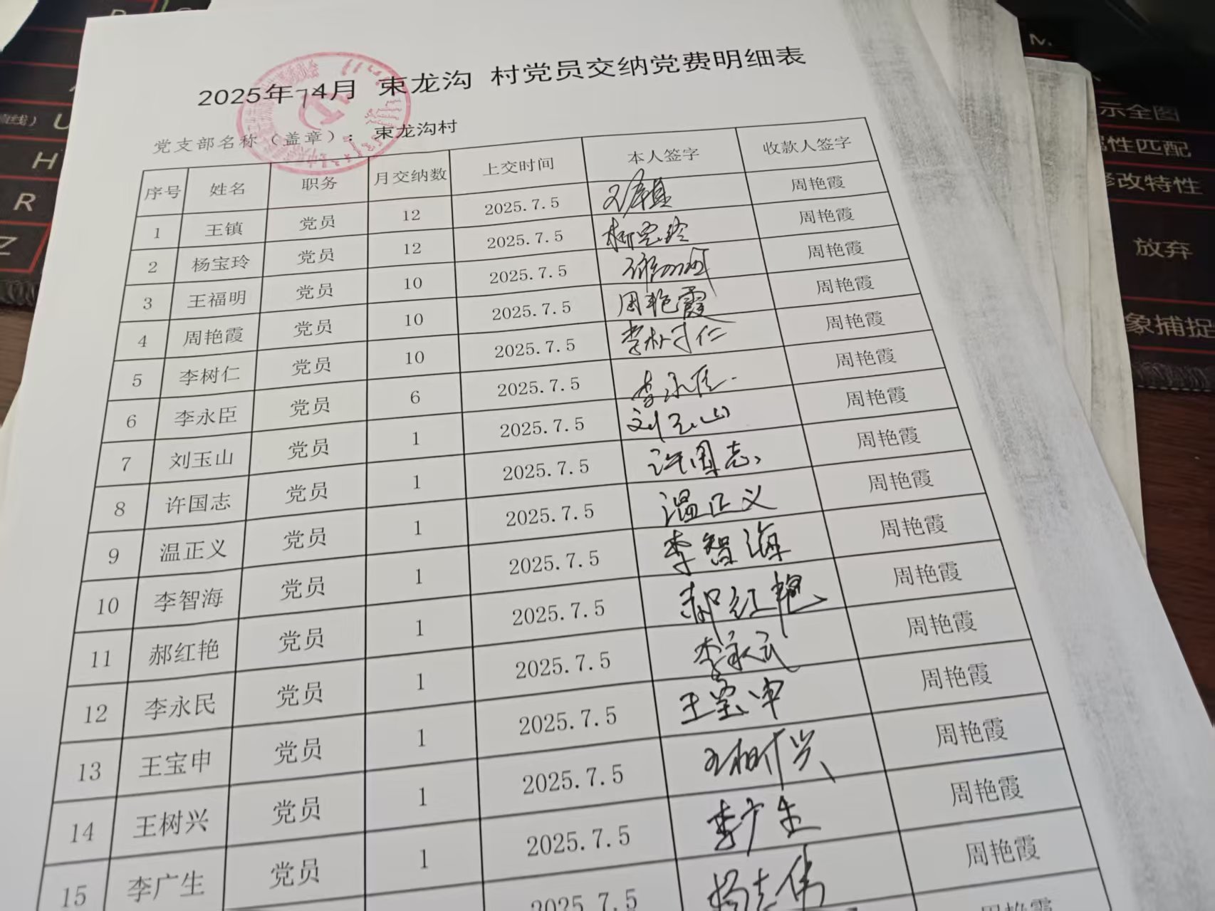 束龙沟村7月份党费收缴明细