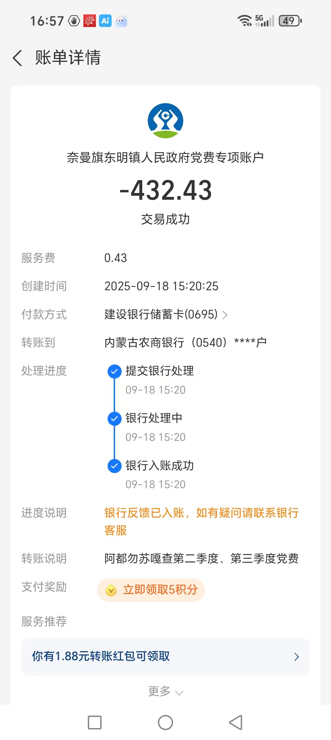 阿都勿苏嘎查2、3季度党费