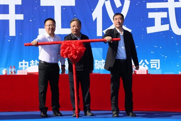 仪式现场,李耀强、玄东升、吕国华共同启动了天然碱项目溶采试验装置。