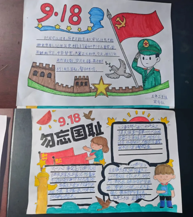 随后,组织学生开展国防安全教育手抄报制作活动。在老师的指导下,学生们围绕“国防安全”“铭记918”等主题,充分发挥想象力与创造力。他们有的用画笔勾勒出党旗、长城等象征国家的图案,并写下自己对“爱国”的理解与感悟。色彩鲜明的画面、真挚有力的文字,不仅展现了学生们的创作才华,更凝聚着他们对祖国的热爱与对和平的珍视。