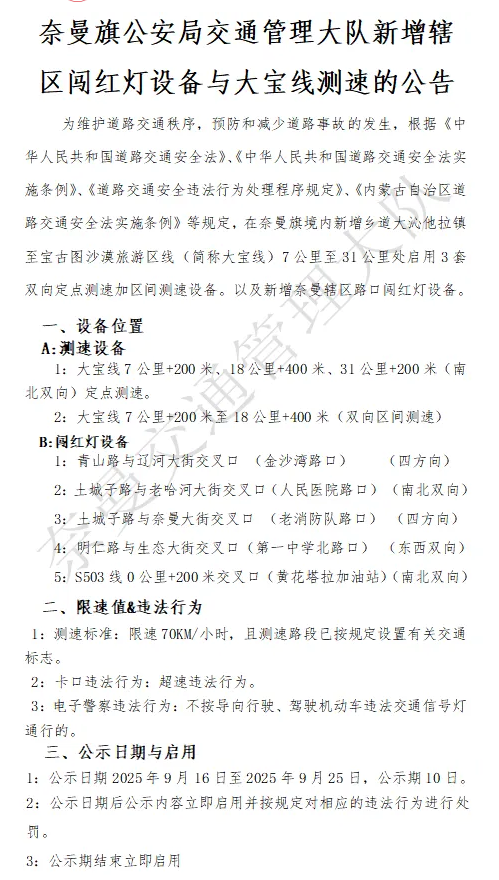交通运输---奈曼旗公安局交通管理大队新增辖区闯红灯设备与大宝线测速的公告