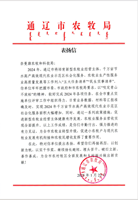 近日,通辽市农牧局发布表扬信,对奈曼旗农牧和科技局2024年工作予以高度肯定。2024年,通辽市将培育新型农牧业经营主体等工作列为重点。奈曼旗农牧和科技局积极响应,精准把握上级要求,高效完成各项任务。在全市重点实施单位评审中组织得力,数据材料汇报及时准确,推动千万亩节水高产高效现代农业示范区社会化服务面积大幅增长,同时促进新型农牧业经营主体健康发展,农牧业服务业营收显著提升。此次表扬,激励着奈曼旗农牧和科技局持续创新实干,为全市农村牧区发展和乡村振兴贡献更多力量。