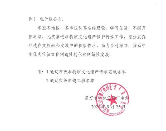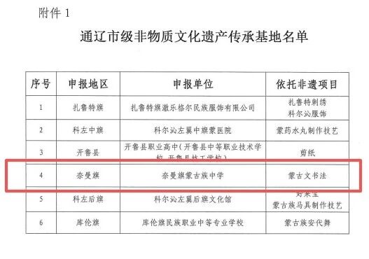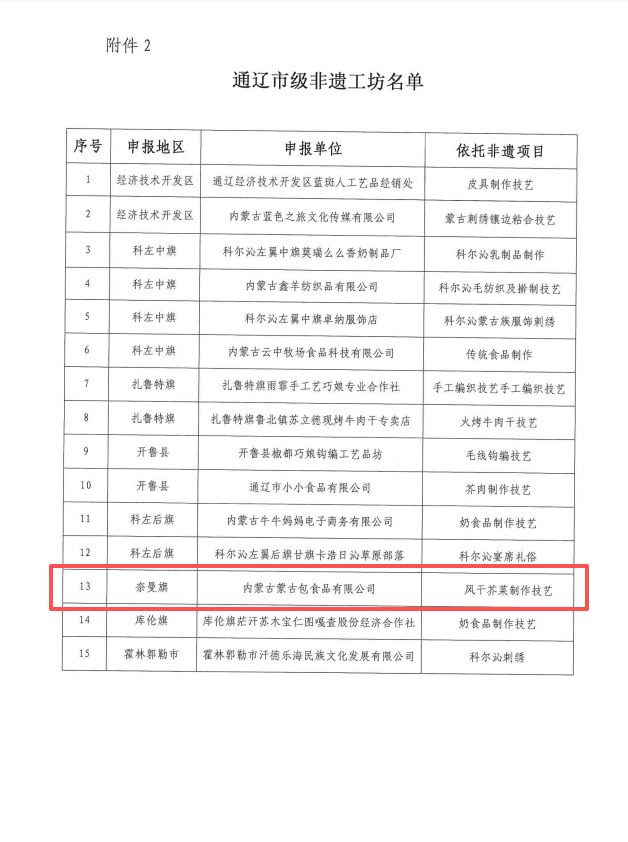 近日,通辽市文化旅游广电局公布了2025年市级非物质文化遗产传承基地、非遗工坊名单。奈曼旗2家非遗保护单位入选,分别是奈曼蒙中蒙古文书法传承基地和内蒙古蒙古包食品有限公司风干芥菜制作技艺非遗工坊。