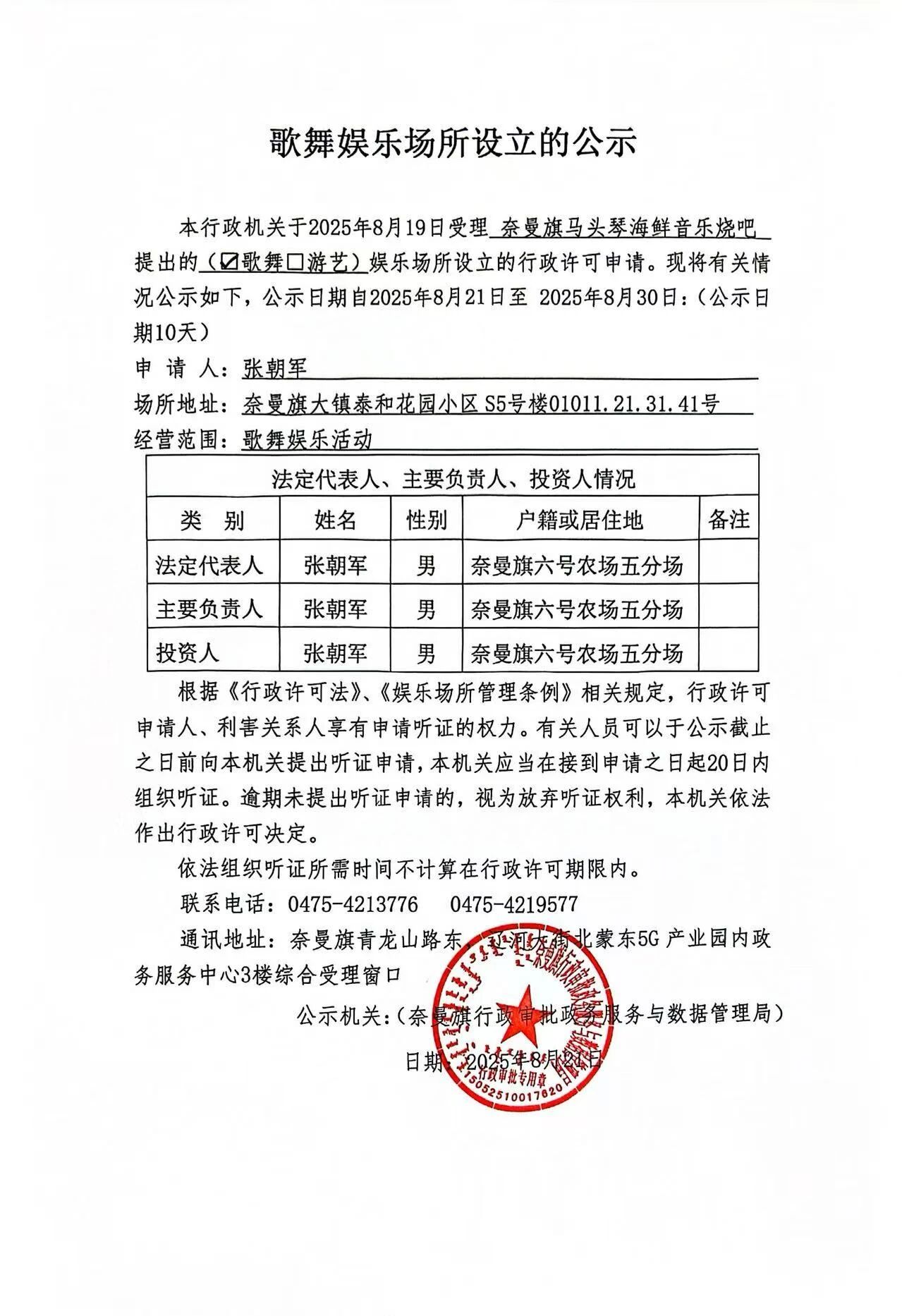 奈曼旗行政审批政务服务与数据管理局关于歌舞娱乐场所设立的公示
