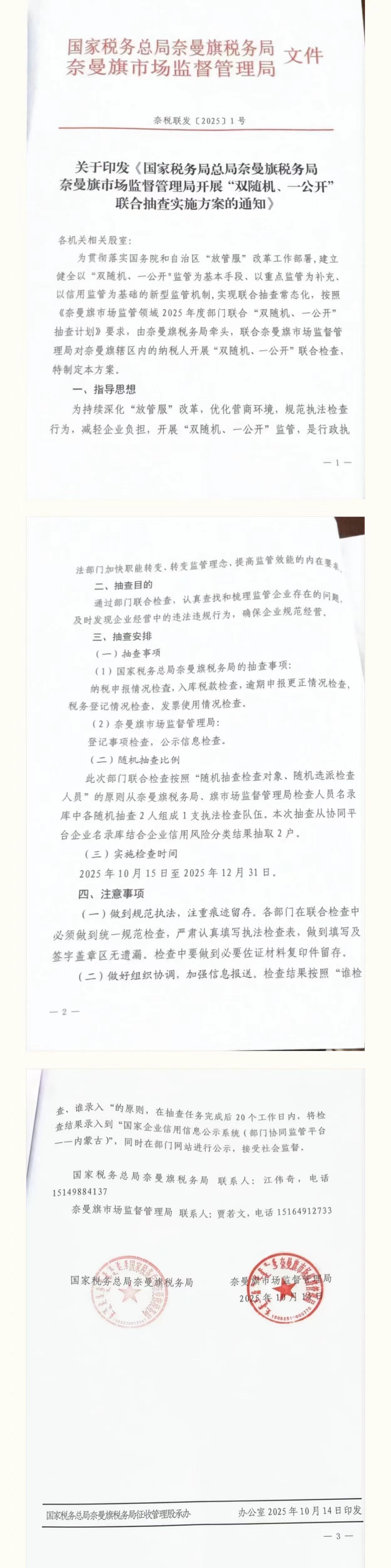 关于印发《国家税务局总局奈曼旗税务局 奈曼旗市场监督管理局开展“双随机、一公开” 联合抽查实施方案的通知》