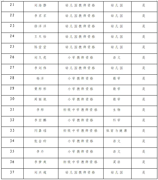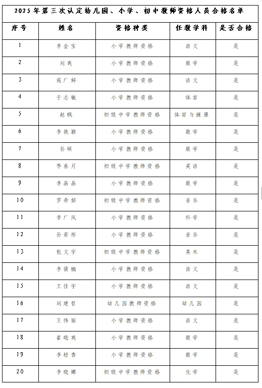 2025年第三次奈曼旗行政审批政务服务与数据管理局受理的幼儿园、小学和初中教师资格认定申请人,经过网上报名、体检和考察等程序,拟认定以下37名申请人的教师资格,现将拟通过人员名单予以公示(附件)。如发现其中不符合《教师资格条例》规定的对象,请在公示期内通过来信、来电、来访等形式向奈曼旗行政审批政务服务与数据管理局举报反映。公示时间:2025年10月14日-10月22日联系电话:0475-4219577 邮寄地址:奈曼旗大沁他拉镇辽河大街与青山路交汇东侧50米电子邮箱:nmqzwfwjbgs@163.com