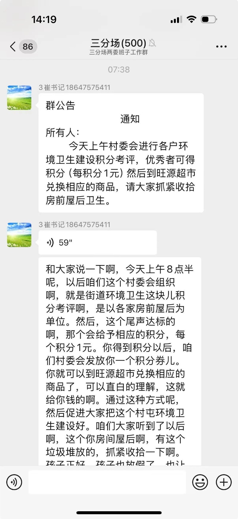 为持续激发居民参与热情,三分场同步推行“文明积分”制度。将参与“美丽庭院”创建、志愿服务、遵守村规民约等文明行为量化为积分,居民可凭积分到指定兑换点换取生活用品。“扫扫院子、帮帮邻居就能换东西,这事儿划算!”村民们的热情被有效点燃,主动清理庭院杂物、参与公共区域保洁的人越来越多,昔日的“零散行动”变成了“集体自觉”。