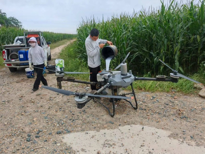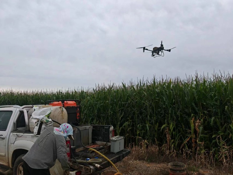 作业现场,飞防人员有条不紊地调配农药,随后操控无人机缓缓升空。在无人机的精准作业下,杀虫剂、杀菌剂与叶面肥均匀洒落在玉米田间,一次喷施便实现了稳植株、防病害、提单产的多重目标,高效且精准地完成了田间管理关键环节。