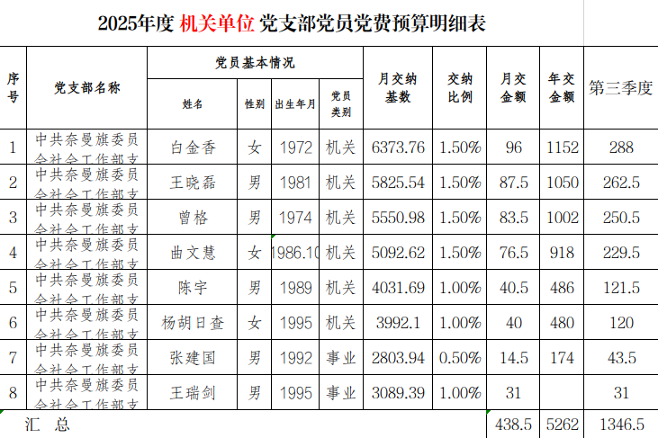 中共奈曼旗委社会工作部党支部2025年第三季度党费收缴明细