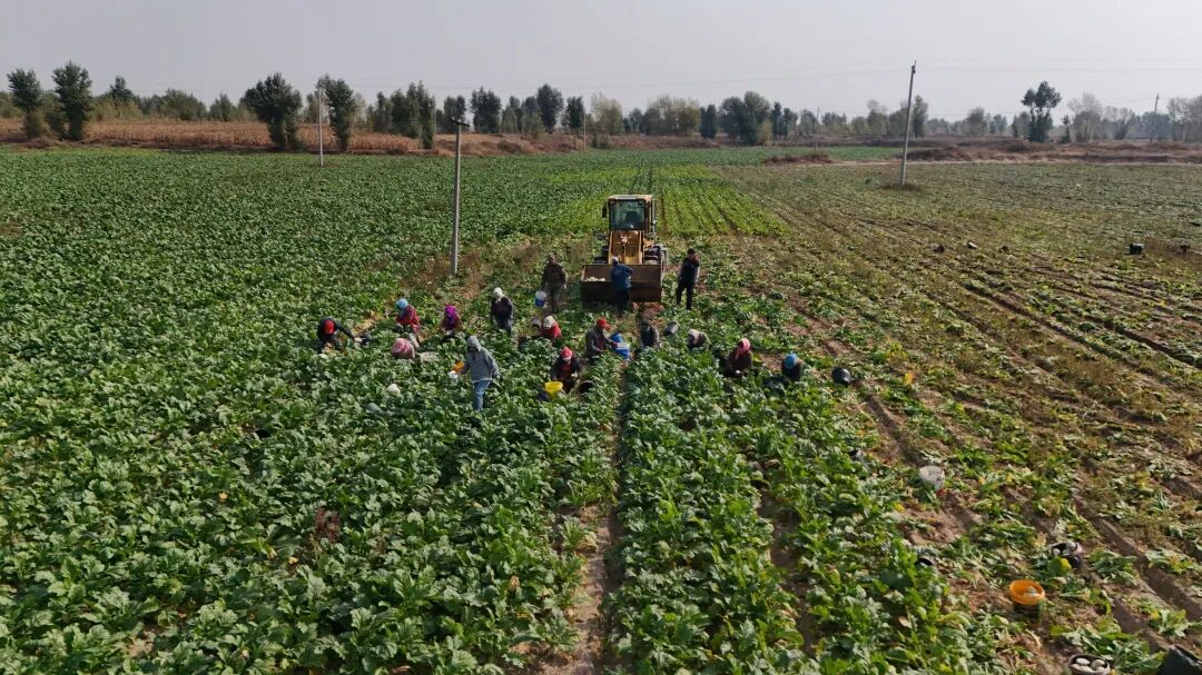与设施大棚里的热闹不同,哈如拉甸子村的田野上又是另一番丰收景象,210亩芥菜田一望无际,硕大的芥菜紧紧扎根在土里,翠绿的菜叶在阳光下泛着光泽。一群工人正在起芥菜,手拿镰刀给芥菜去缨、装车,田间地头满是欢声笑语。