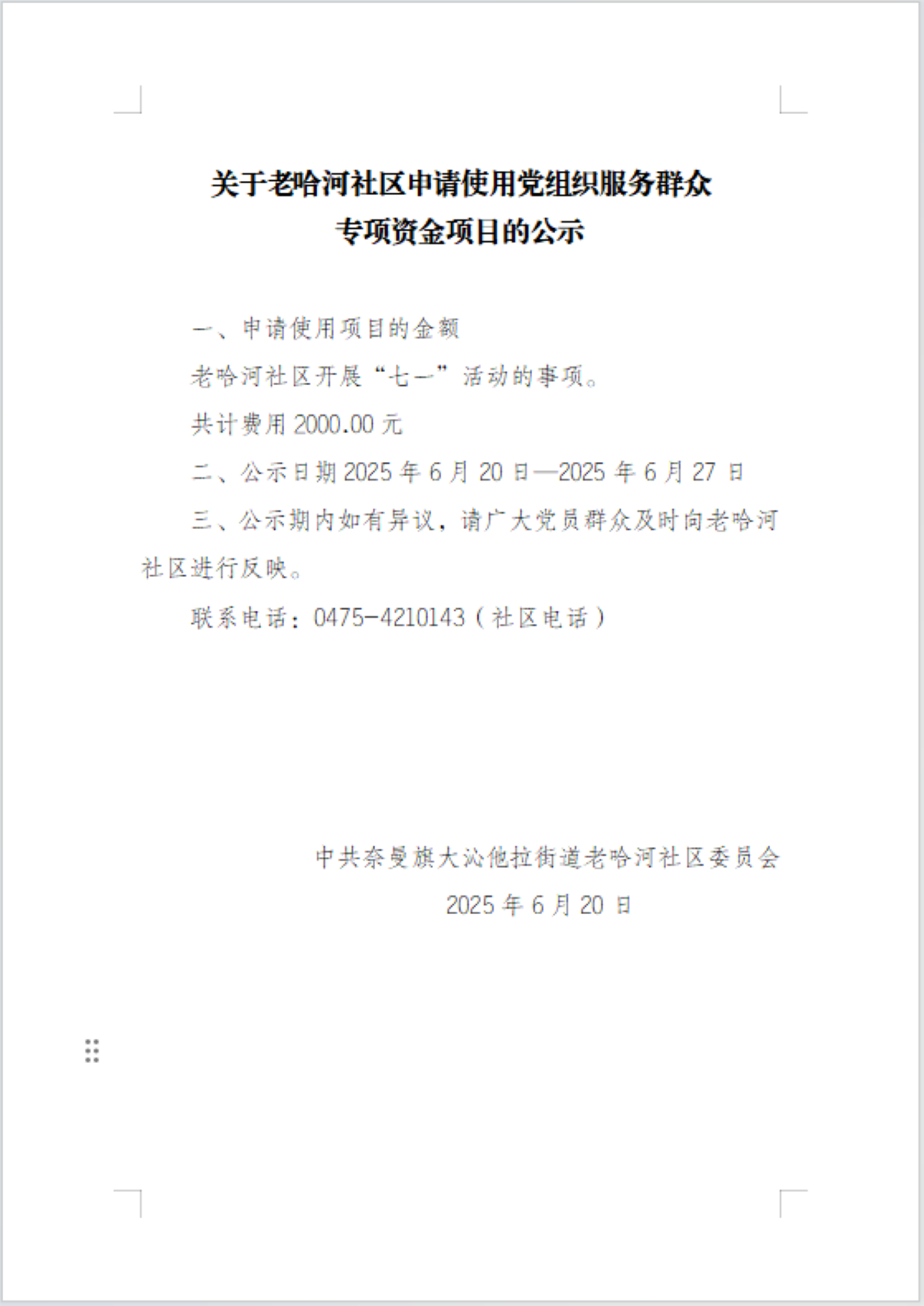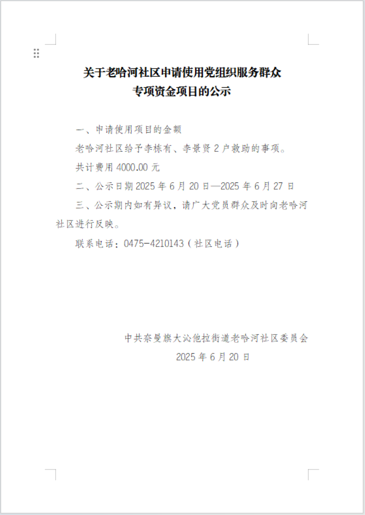 2025年老哈河社区6月份党组织服务群众专项资金项目公示表。