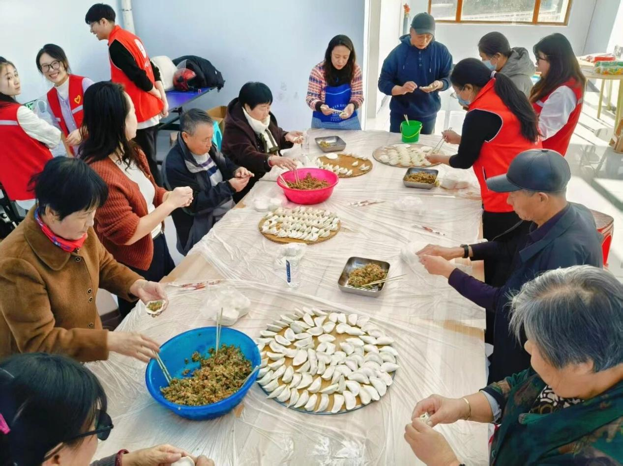 这边义诊、教学、游戏有序进行着,那边也是一片繁忙的景象:社区工作人员、网格员们正在忙着调馅、擀皮,参加完活动的长辈们也加入其中,一起包饺子。大家分工合作,默契配合,欢声笑语间,一个个元宝状的饺子便整整齐齐摆满盖帘。