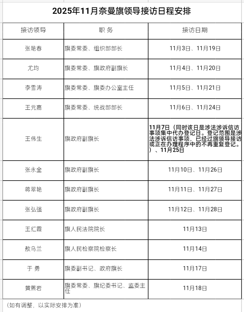 为进一步畅通信访渠道,维护群众合法权益,现将2025年11月奈曼旗领导接待来访群众日程安排公示如下: