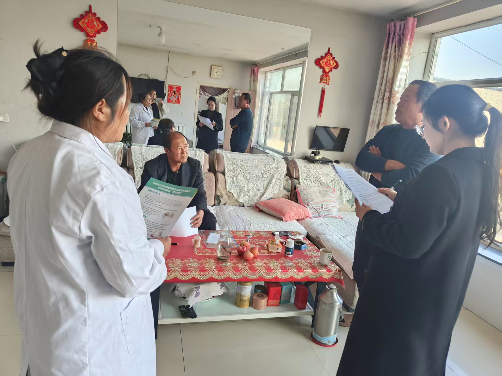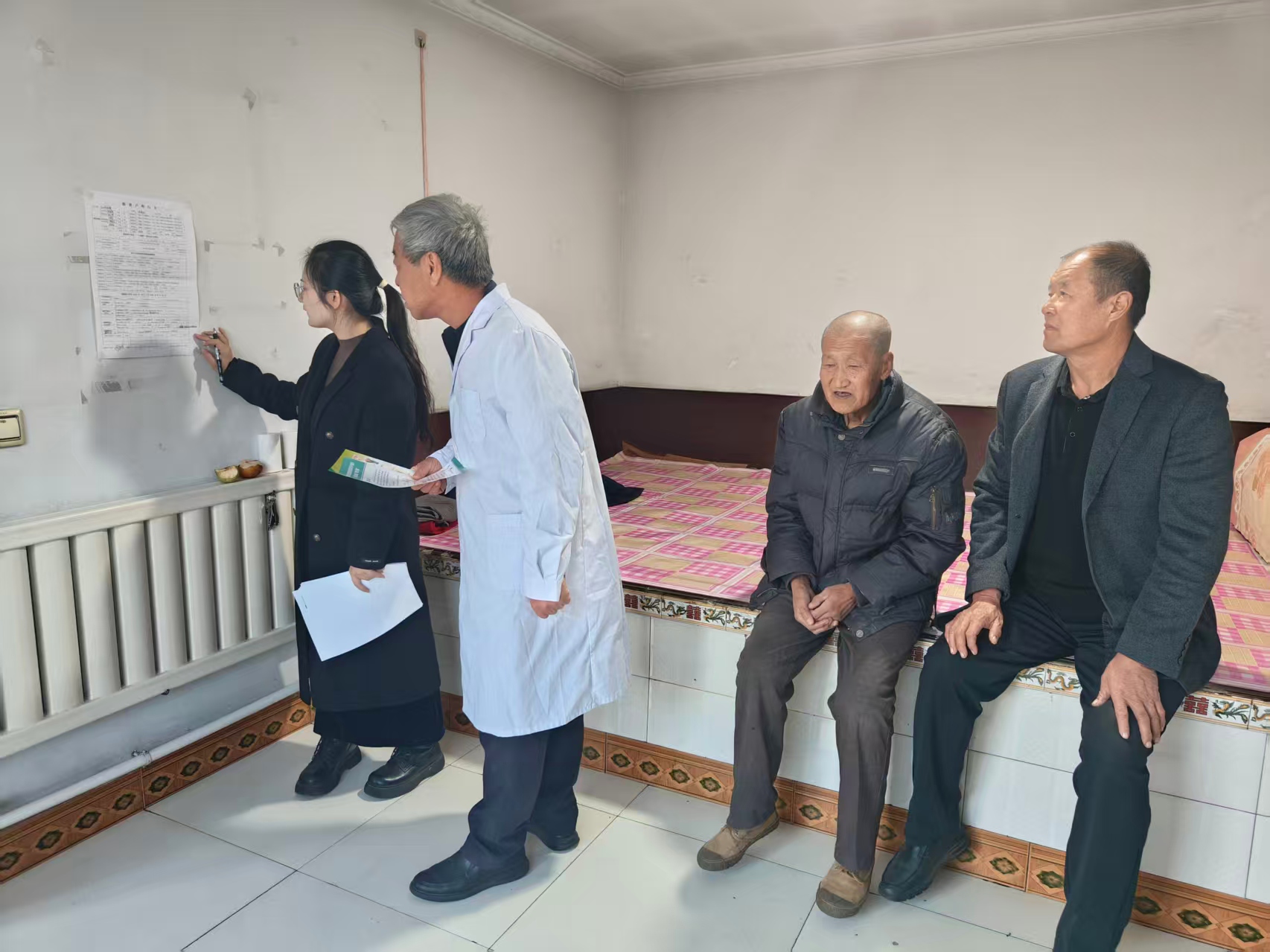 沙日塘村两委、包村干部、村医共同入户核实贫困户明白卡填写内容