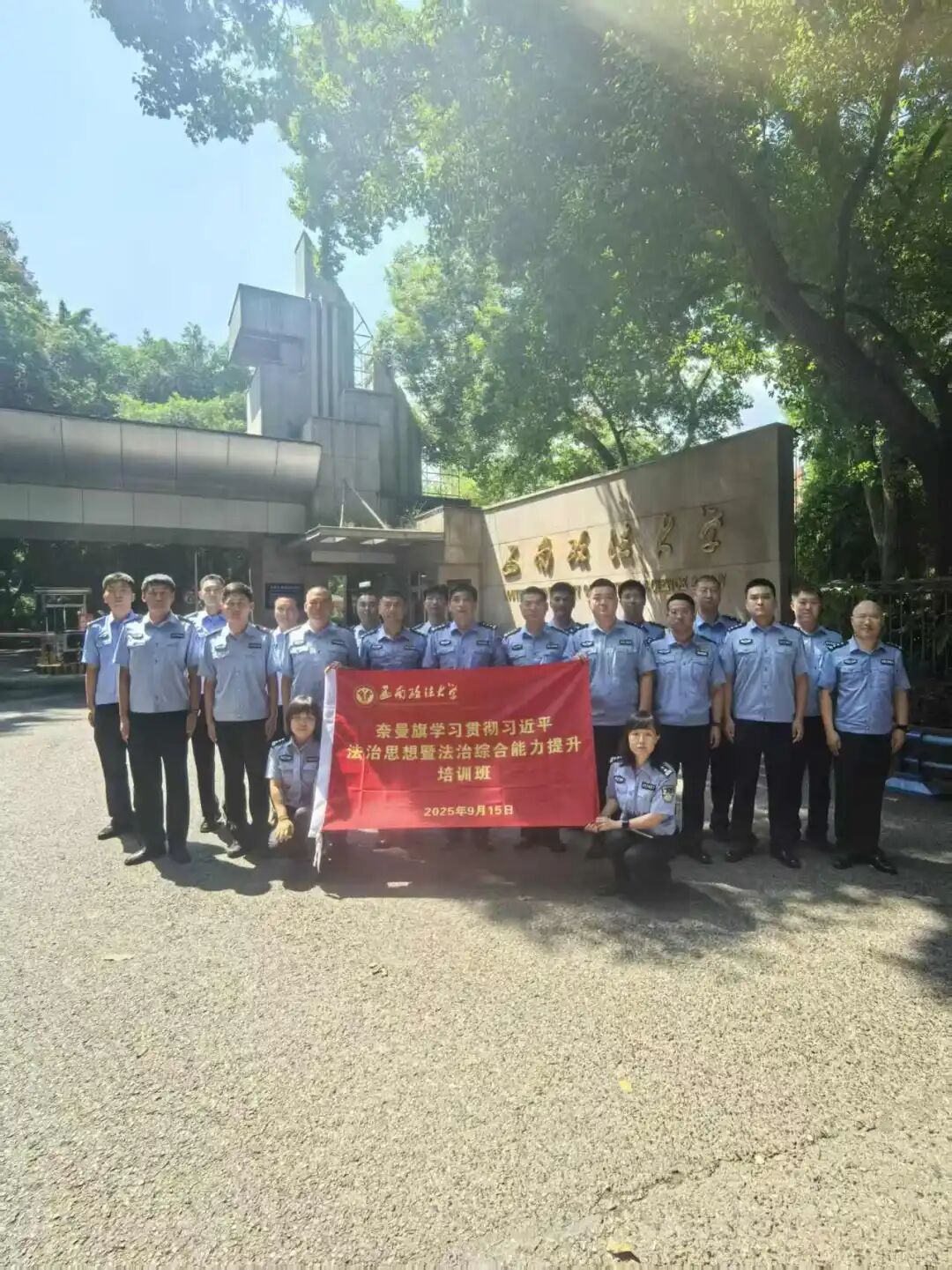 为深入学习贯彻习近平法治思想,提升公安民警法治综合能力,9月15日至19日,奈曼旗公安局党委副书记、政委丁立勇带领20名环节干部参加了由旗委组织部、政法委组织的奈曼旗学习贯彻习近平法治思想暨法治综合能力提升培训班。此次培训班在西南政法大学举办,来自全旗依法治旗各小组成员单位,行政执法单位,政法系统领导干部及业务骨干共51名学员参训。